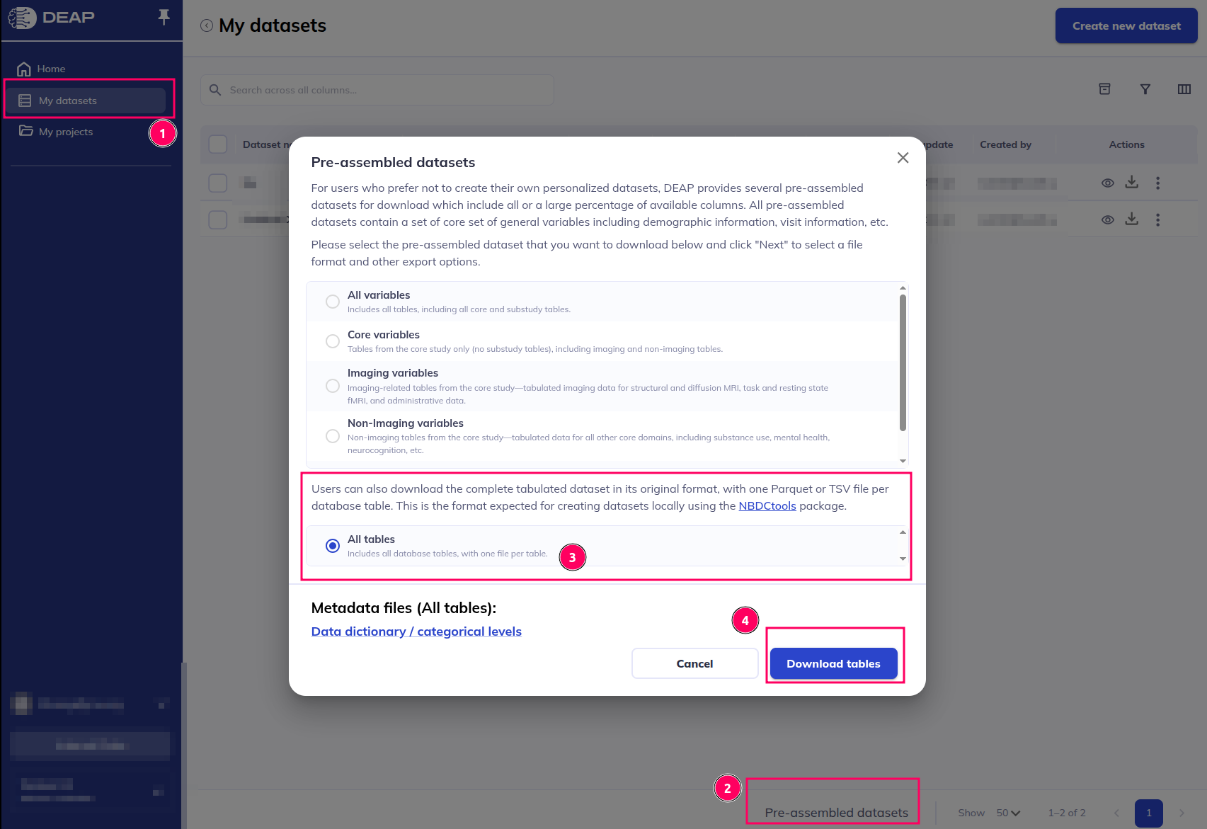 The package assumes that users downloaded the complete tabulated dataset as file-based data and saved the files in a local directory. Using functions from the package, users can then create custom datasets by specifying the study name and any set of variable names and/or table names in its data dictionary.